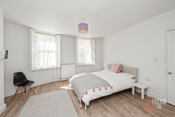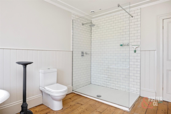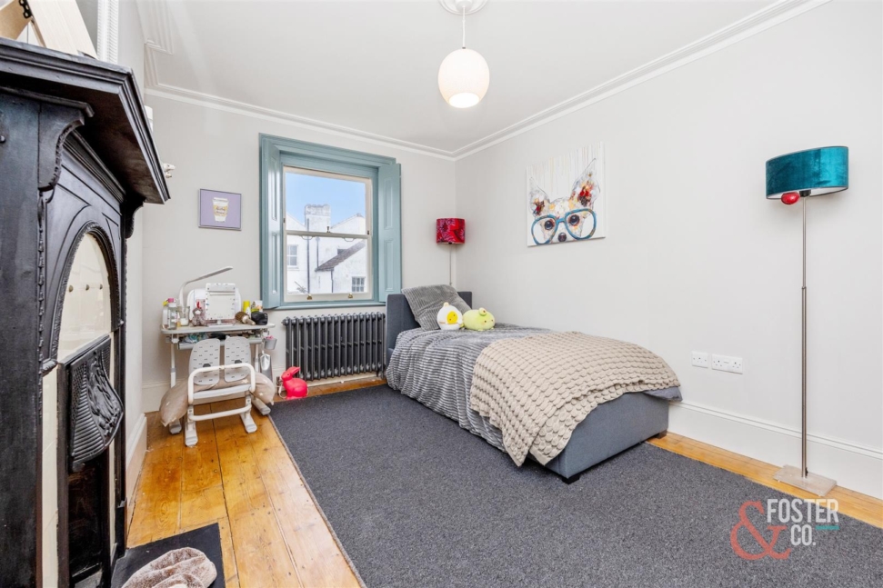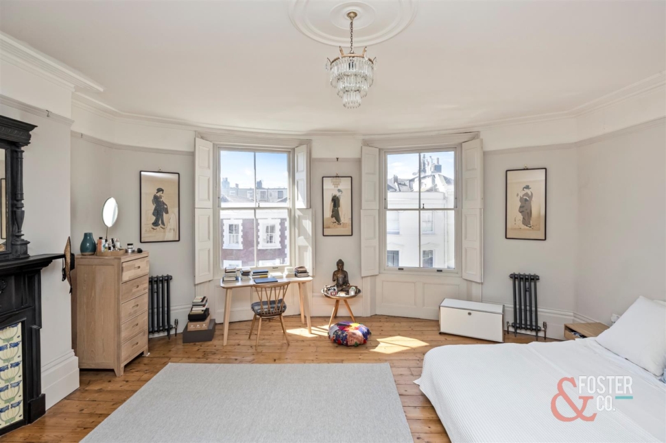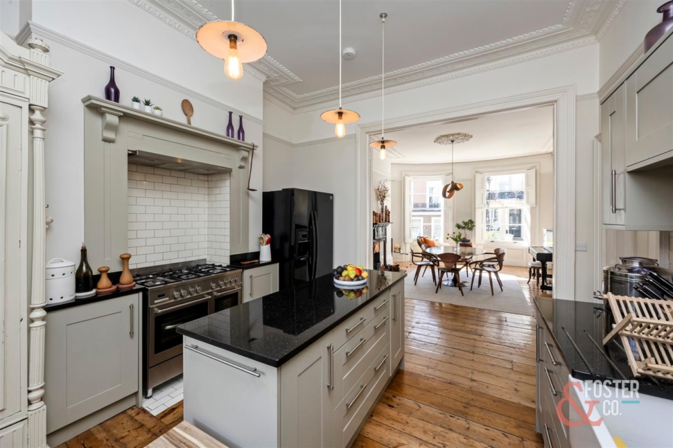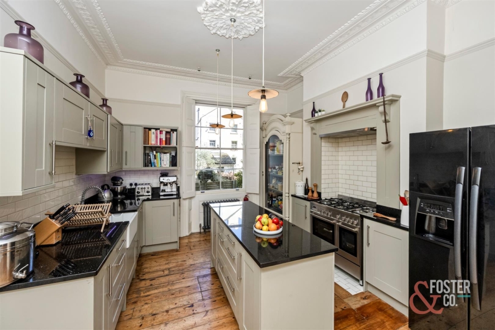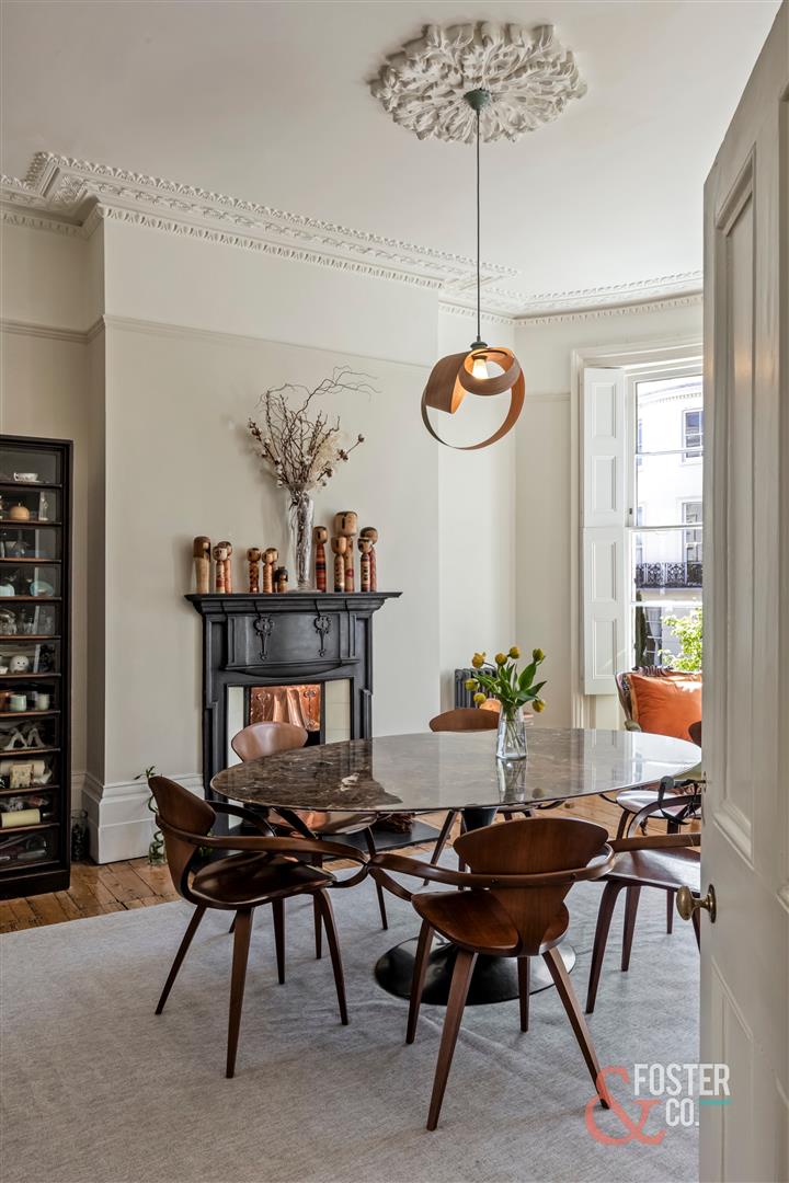 The accommodation is arranged over several levels and offers a wonderfully versatile layout, ideal for family occupation. On the ground floor, there is a beautiful front reception room of excellent size and elegance, while to the rear a well appointed kitchen leads through to a garden room with direct access onto the sunny rear garden. Across the upper floors are a collection of generous double bedrooms and bathrooms, each continuing the home’s classic Regency character, sense of volume and refined presentation.