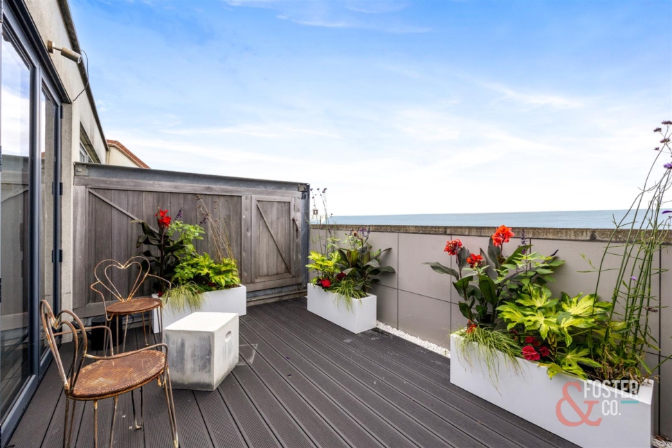 - Top floor sitting room with full-height glazing opening to private roof terrace with sea views