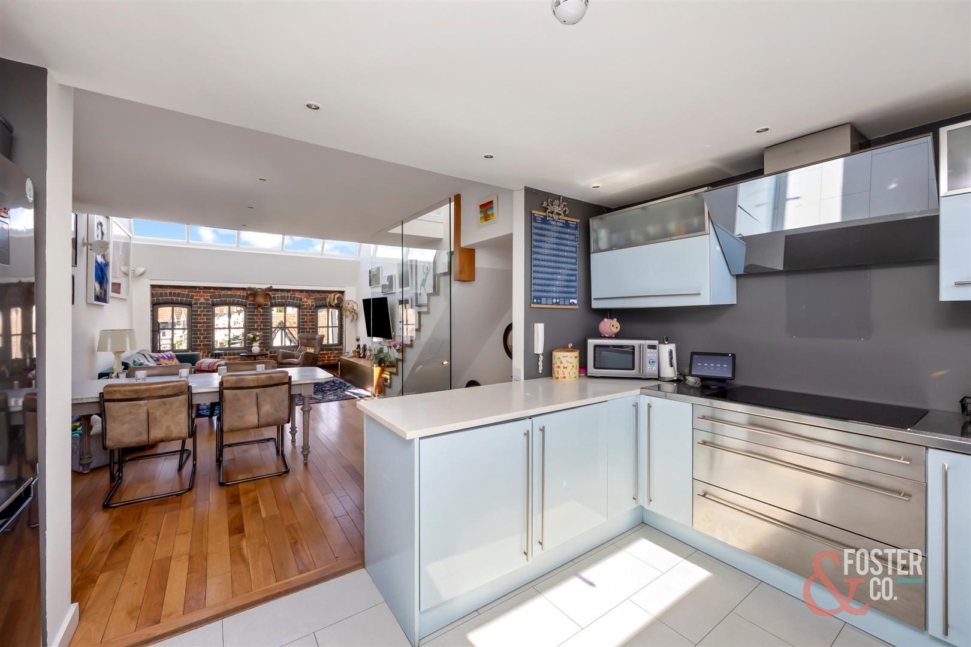 The second floor forms the heart of the home with an expansive open-plan kitchen, dining and living space. Here, original brickwork, arched factory windows and lofty proportions combine to create a dramatic yet comfortable setting for modern living and entertaining.