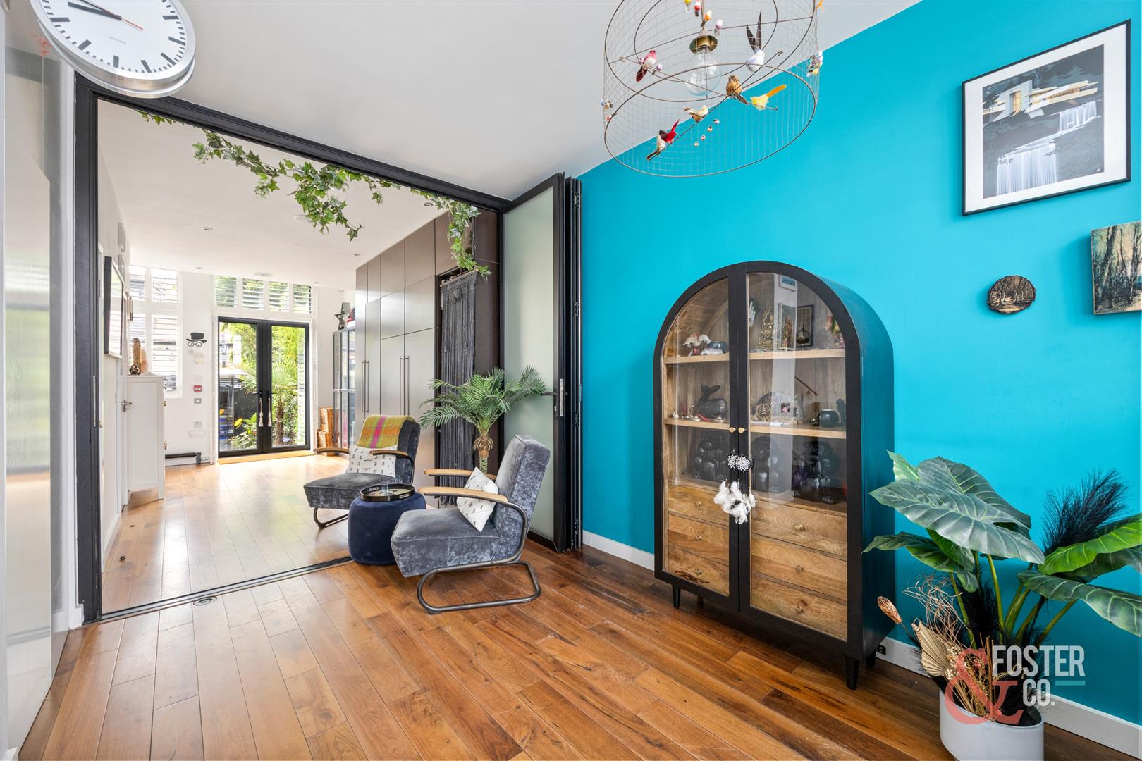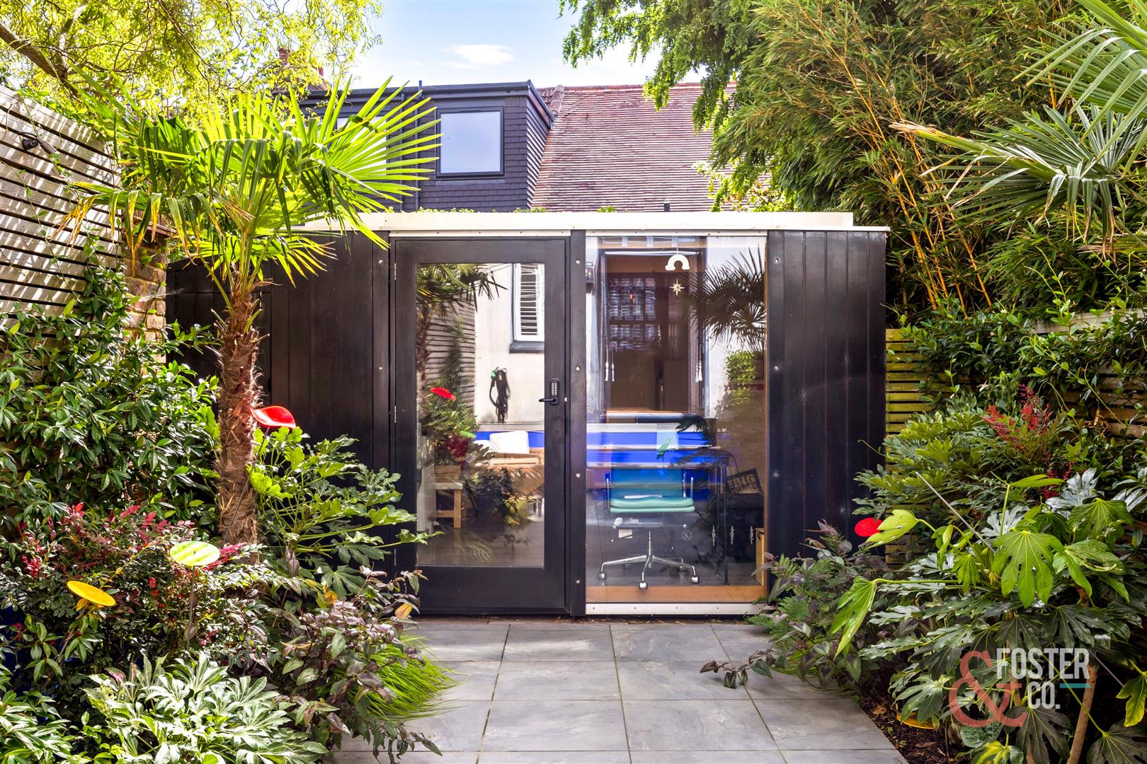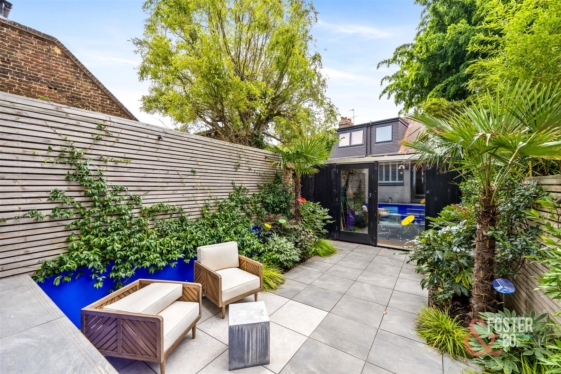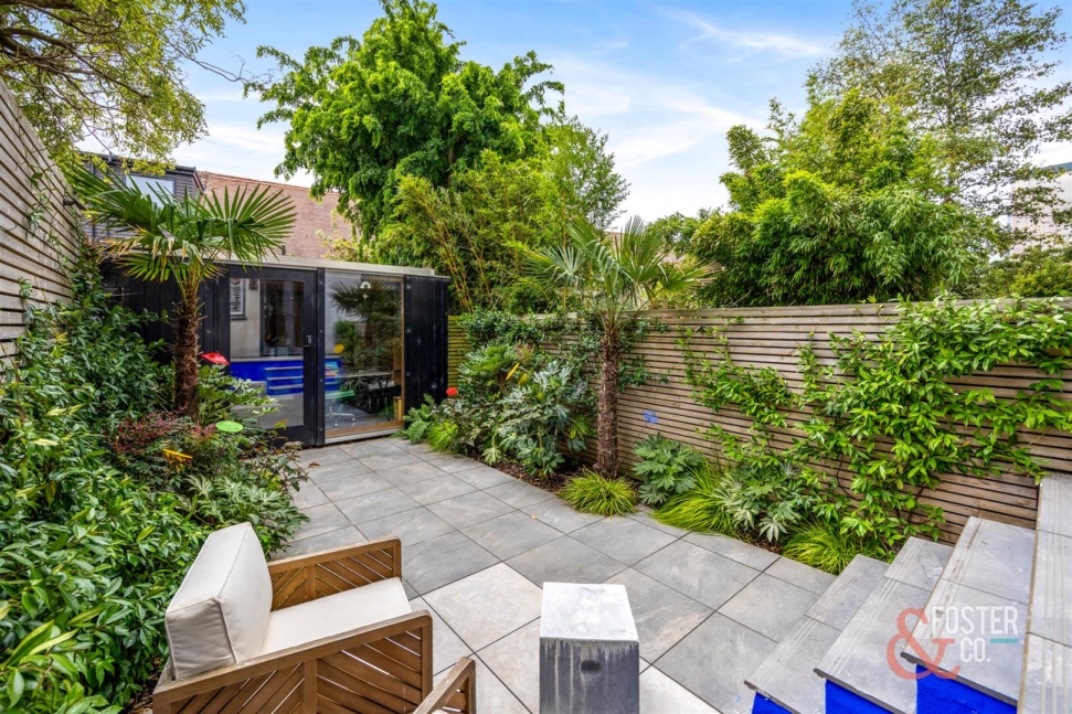 Externally, the rear garden has been redesigned into a lush, low-maintenance retreat with tropical planting, tiled paving and a versatile garden studio. The studio is fully powered and hardwired with internet connection, making it perfect as a home office, gym or creative workspace.
