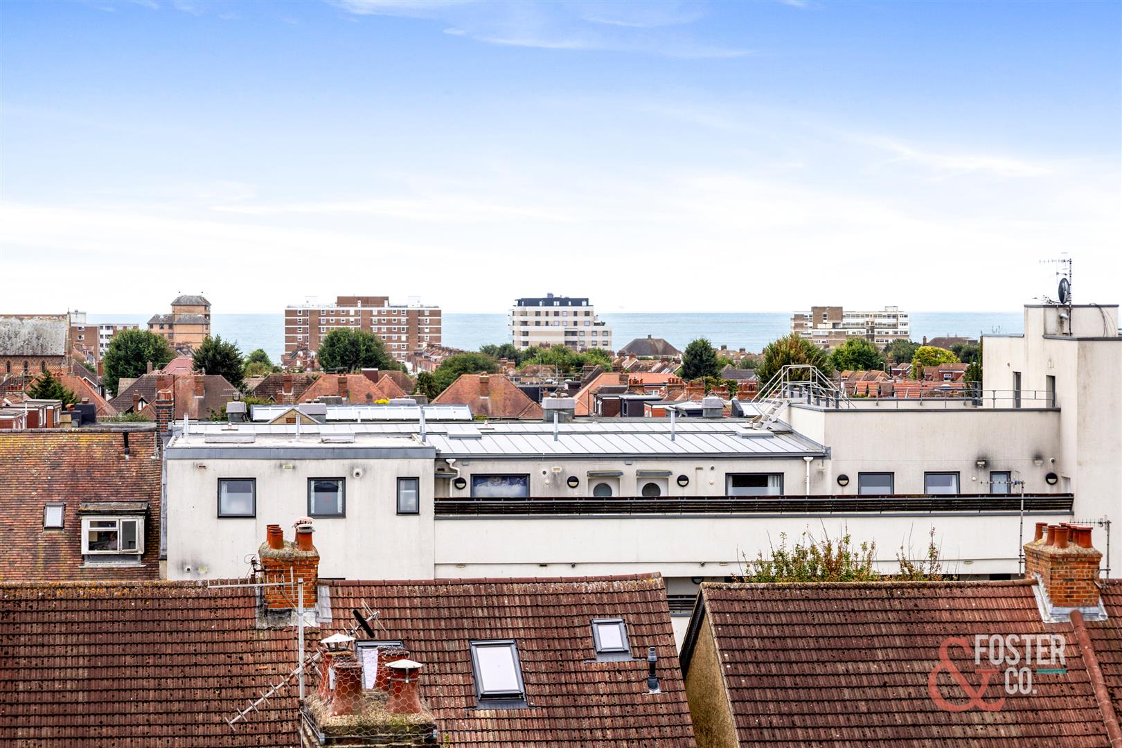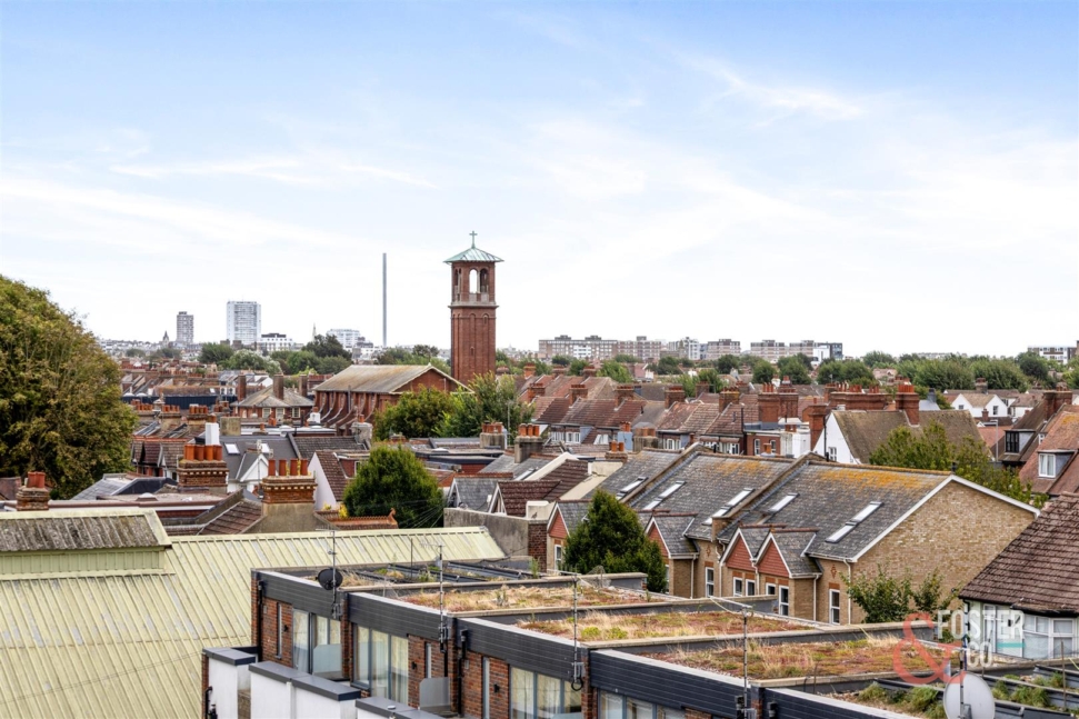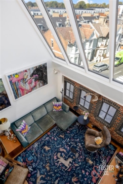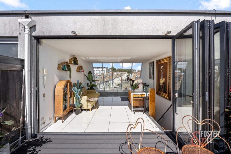 On the top floor, a further sitting area opens via full-height glazed doors onto a private roof terrace, with far-reaching views across the rooftops of Hove and out to sea.