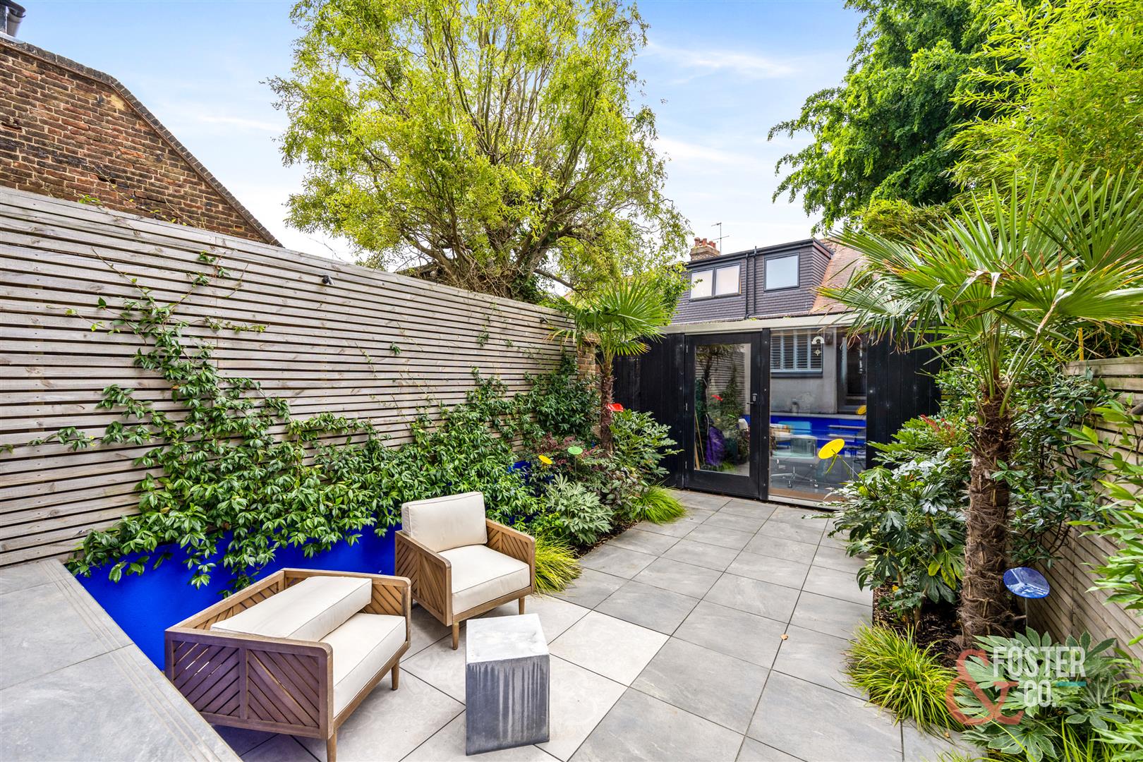 - Landscaped rear garden with tropical planting and tiled flooring