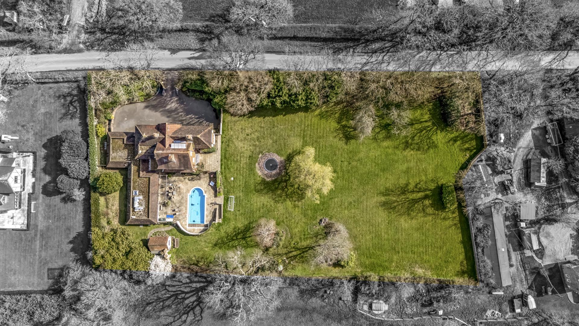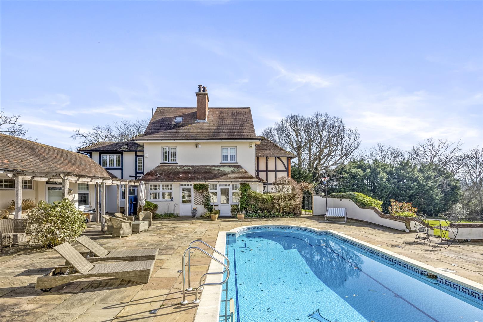 The south facing garden is laid mainly to lawn with a number of mature trees bordering the property. The walled “Mediterranean-style” patio area with heated swimming pool and pool house creates the perfect space for outside entertaining.